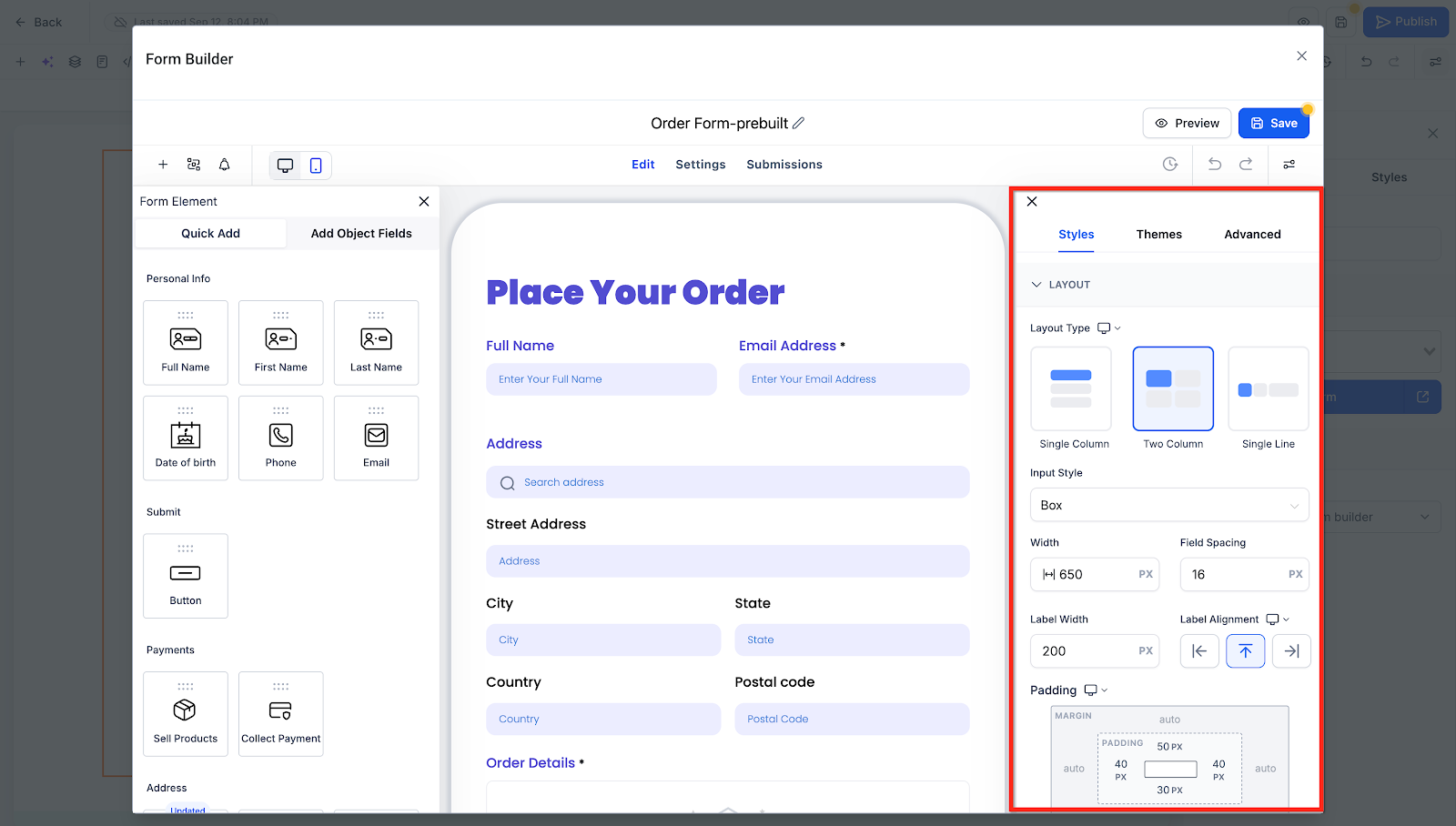 • Fields: Add, remove, and reorder fields; map to custom fields where needed.