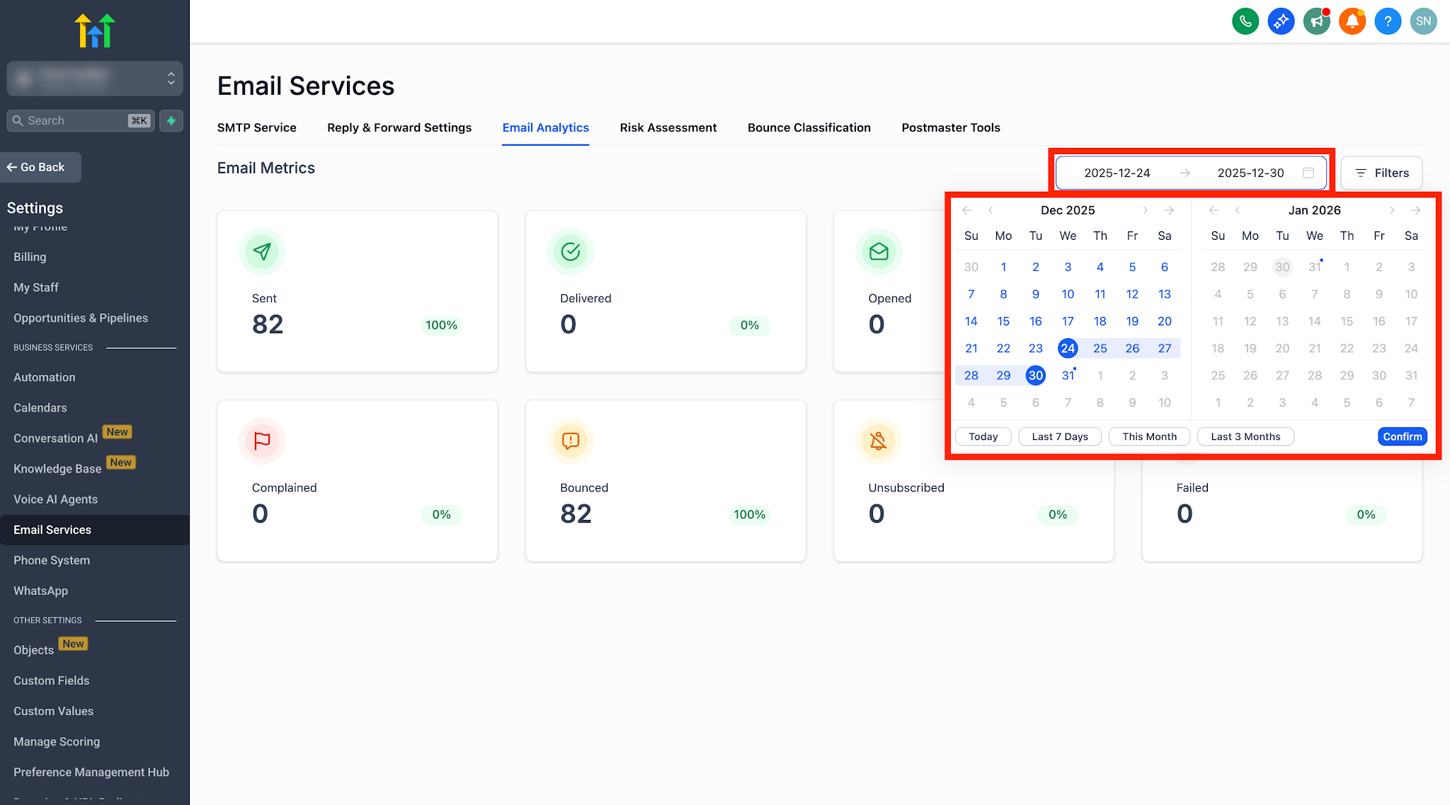 Use the Date Range picker at the top of Email Analytics; click Refresh to apply.